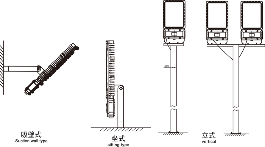 安裝方式:A:吸頂式 b:管吊式 c:吸壁式 d:法欄立桿式 e:護欄立桿式