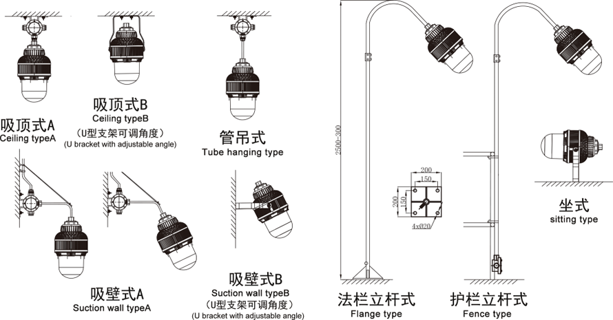 安裝方式:A:吸頂式 b:管吊式 c:吸壁式 d:法欄立桿式 e:護(hù)欄立桿式